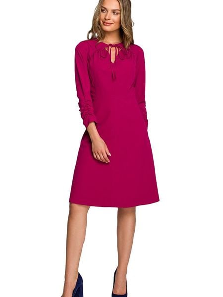 – dekolt: z rozcięciem- zapięcie: suwak na plecach- zakończenie rękawów: marszczenie- detale: ozdobne wiązanie- krój: rozkloszowany