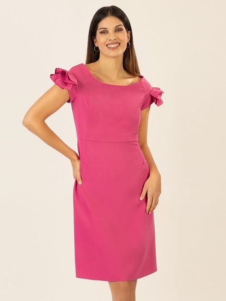 – dekolt: łódka- zapięcie: suwak na plecach- krój rękawów: motylek- krój: litera A- look: jednokolorowy