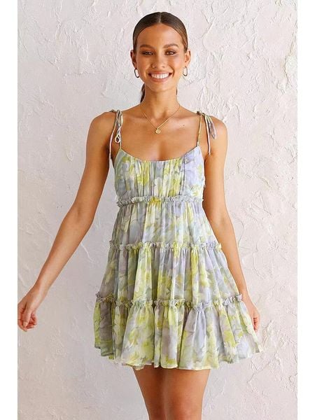 – ramiączka: wąskie- dekolt: okrągły- partia pleców: marszczona- dolny brzeg: z falbankami- detale: falbanki- krój: litera A- wzór: kwiatowy