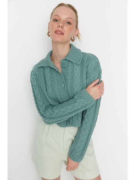 – kołnierz: kent- zapięcie: listwa guzikowa- wzór splotu: warkocz- krój: cropped- look: jednokolorowy