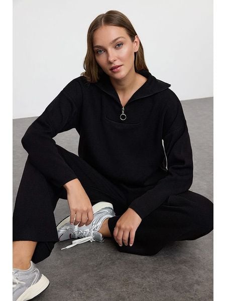 W zestawie:Sweter:- kołnierz: stójka- zapięcie: krótki zamek błyskawiczny- krój: luźny- look: jednokolorowySpodnie:- pas / ściągacz: elastyczny- krój: luźny- look: jednokolorowy