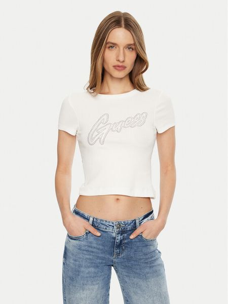 GUESS Biały t-shirt damski ze złotym haftowanym cyrkoniami logotypem slim fit, Rozmiar S