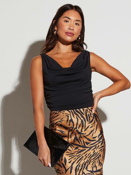 – ramiączka: szerokie- dekolt: kaskada- detale: ozdobna zakładka- krój: prosty- look: jednokolorowy