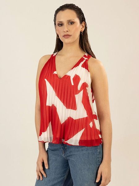 – ramiączka: szerokie- dekolt: V- zapięcie: guzik na plecach- krój: luźny- wzór: na całości- look: plisy