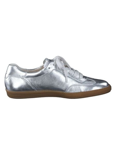 – zapięcie: sznurowanie- noski: zaokrąglone- noski i zapiętki: wzmocnione- powierzchnia: z metalicznym połyskiem- skórzana wkładka: tak- podeszwa: antypoślizgowa