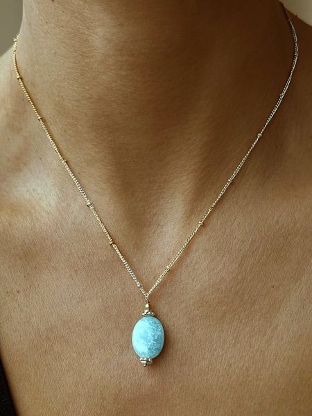 – materiał: mosiądz- powłoka: 18K złoto- typ łańcuszka: ankier- zapięcie: karabińczyk- rodzaj kamienia: amazonit- kolor kamienia: turkusowy- kształt zawieszki: medalion- regulacja długości: takWskazówka: Zdjęcie produktu w powiększeniu.